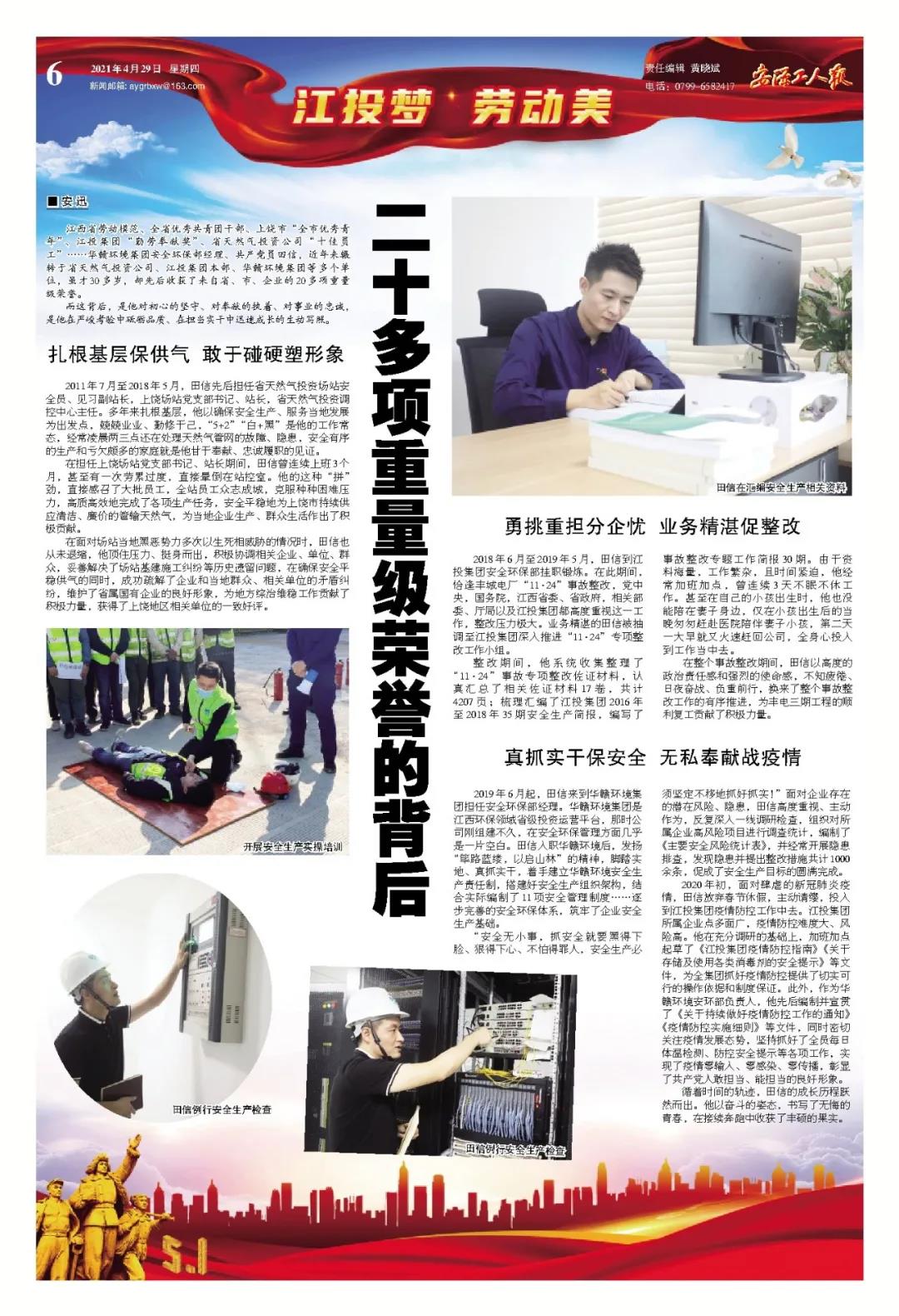 江西省劳动模范、全省优秀共青团干部、上饶市“全市优秀青年”、银河娱乐 “勤劳奉献奖”、省天然气投资公司“十佳员工”……华赣环境银河娱乐安全环保部经理、共产党员田信,近年来辗转于省天然气投资公司、银河娱乐 本部、华赣环境银河娱乐等多个单位,虽才30多岁,却先后收获了来自省、市、企业的20多项重量级荣誉。
