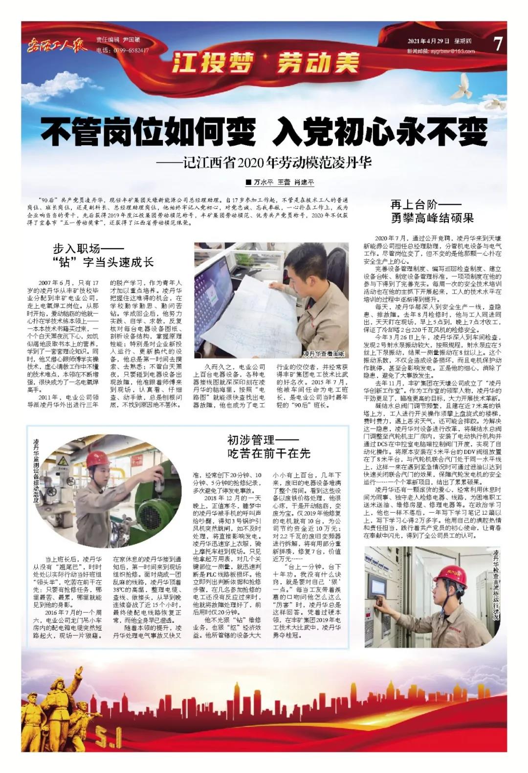 “90后”共产党员凌丹华,现任丰矿银河娱乐天壕新能源公司总经理助理。自17岁参加工作起,不管是在技术工人的普通岗位、班长岗位,还是副科长、总经理助理岗位,他始终牢记入党初心,对党忠诚、忘我奉献,一心扑在工作上,成为企业响当当的骨干,先后获得2019年度银河娱乐 劳动模范称号,丰矿银河娱乐劳动模范、优秀共产党员称号,2020年不仅获得了宜春市“五一劳动奖章”,还获得了江西省劳动模范殊荣。