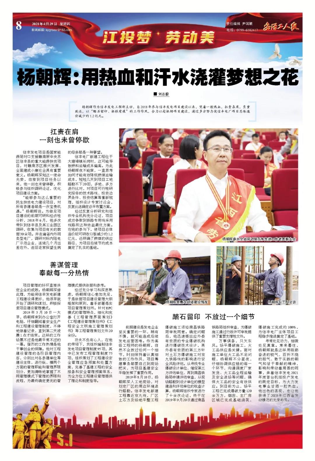 鲜花因汗水而绽放,事业因奋斗而勃兴。安源工人报推出“江投梦 劳动美”特刊,刊载银河娱乐 26名全国、全省及银河娱乐劳动模范的典型事迹,为劳动喝彩,向劳模致敬!