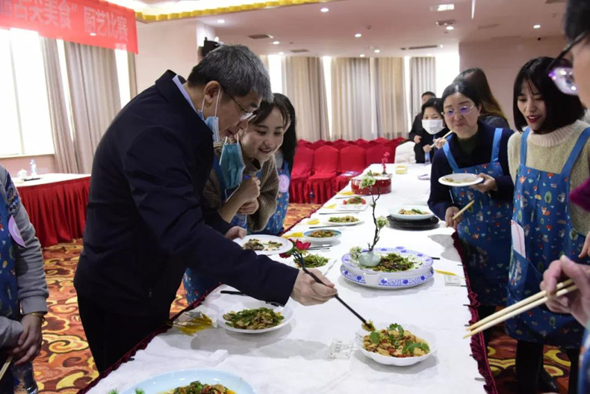 评委们通过对“色、香、味、型”等方面进行评分,最终评选出辣椒炒肉、红烧鲫鱼、小炒牛肉和家乡豆腐4组菜品的前三名。银河娱乐公司领导纷纷到场品尝美食,进行点评,为厨娘们精湛的厨艺点赞,并送上鲜花。