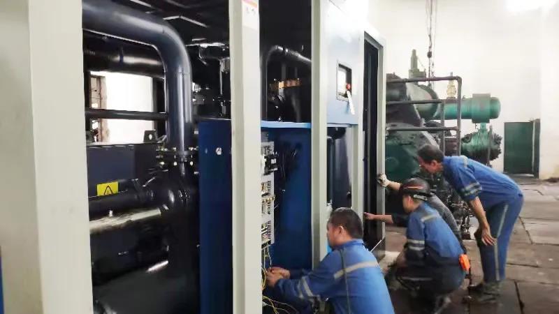 机组更换期间,该公司机电一队队长黄志鸿以身作则,率技术小组,一边研究图纸,一边在现场指挥新旧机组拆装工作。在他们的共同努力下,原有近五吨重的空压机组提前三天被解拆并安全移出。新机组机体安装难度较大,该机组为SCR 两级压缩系列螺杆空压机组,是一种容积式、两级压缩、喷油螺杆压缩机,其主要原理是电机通过齿轮或弹性联轴器与压缩机机头的阳转子相连从而驱动压缩机旋转。机体安装时,必须确保机体底座稳固,机体与各大小管路零误差衔接,密集的控制线路也必须逐条线与控制箱对接,否则不仅影响机体整机运行稳定,还极容易造成安全风险,损失巨大。技术安装组成员系统学习新机组原理,全过程精心操作,最终仅用一周时间,完成了在原机组位置打地坪、新机组整机移装到位。为确保冷却水管路、机组电源与控制连线连接到位,党员喻杰超坚持每天蹲守现场把关,直到密密麻麻的控制线被逐个安装对接完成并贴好标签。